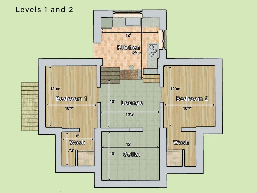 Going further down leads you to two bedrooms, a lounge, a cellar and the kitchen, from where you can go to the garden.