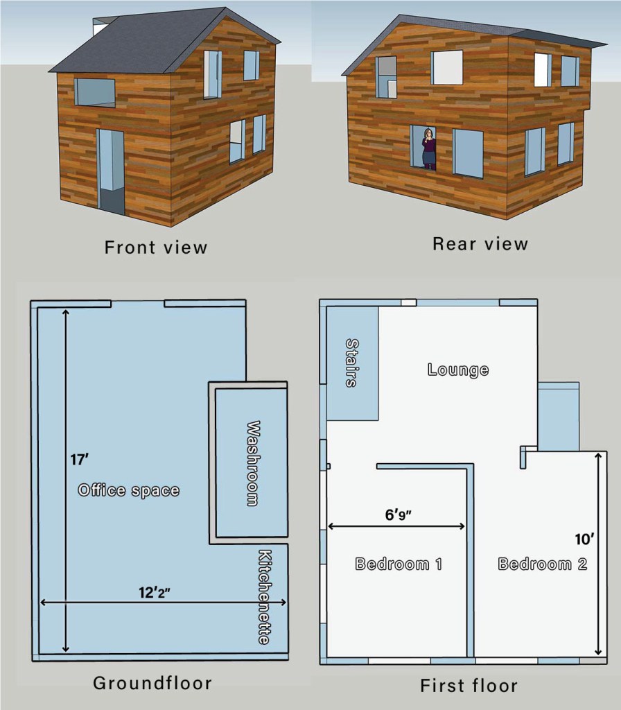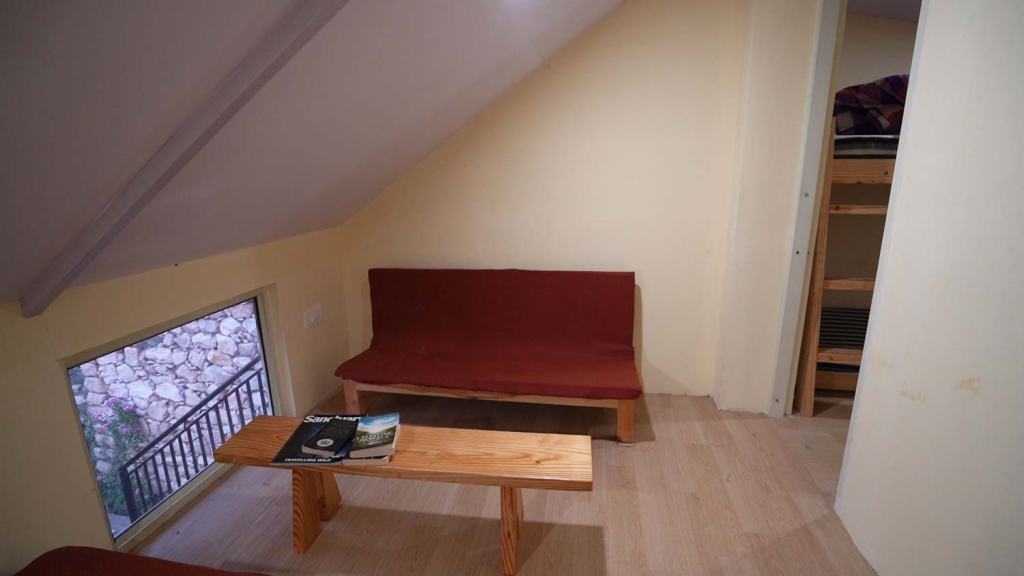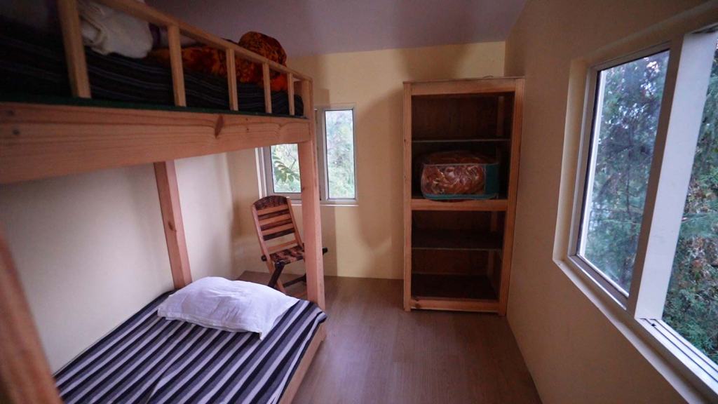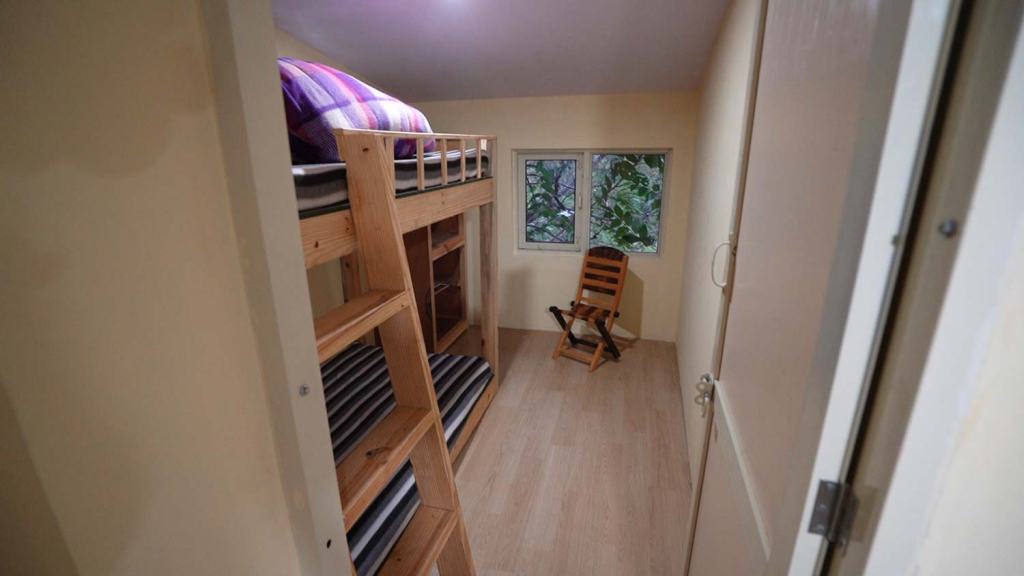 A prefab annexe is used as an office space where 3 persons can work comfortably. It has a kitchenette and a washroom. There is a second story with a sitting area and two bedrooms with bunk beds. So, a total of four people can sleep.