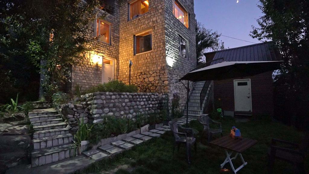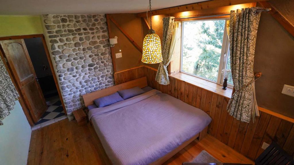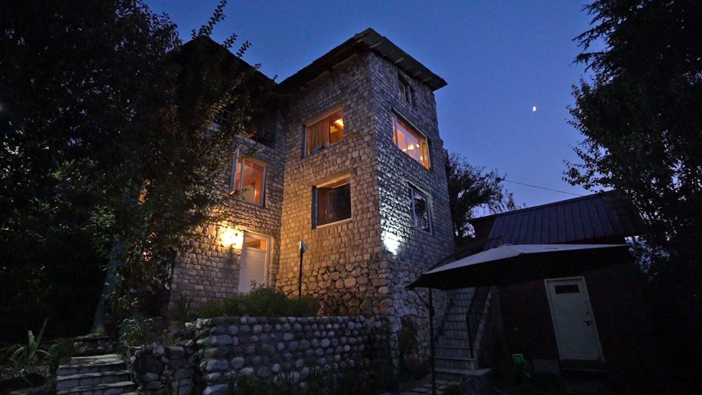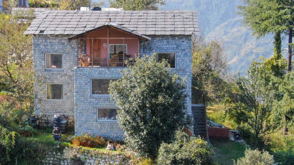 The primary construction material for the outside is local stones with a slate roof. The main entrance of the house is accessible through a garden that has a plunging view of the Tirthan valley. The design of the house has been inspired by the traditional Kath Kuni architecture of Himachal.